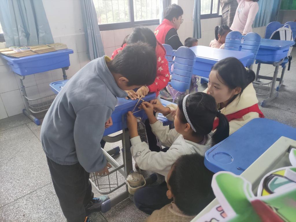 志愿者们分为两组,分别走进二年级和三年级的教室。平日里书声琅琅的课堂,此刻变身为奇妙的“物理实验室”,欢呼与惊叹声此起彼伏。在“纸杯直升机”实验环节,志愿者们演示了如何利用橡皮筋的扭力,让简单的纸杯垂直升空、盘旋飞舞。孩子们目不转睛地盯着那只在空中灵巧转动的“直升机”,眼神中充满了惊奇与跃跃欲试的光芒。