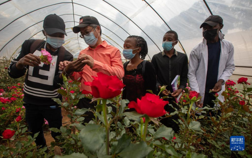 2021年6月25日,在肯尼亚纳库鲁郡的埃格顿大学,来自中国的农学教授刘高琼(左二)和学生们在温室大棚内讨论花卉育种和病虫害防治。新华社记者 张宇 摄