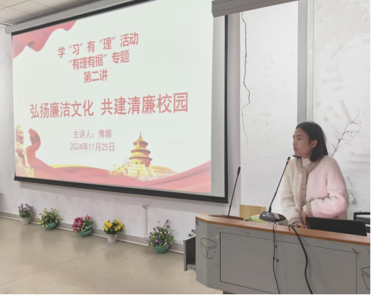 理学院党委副书记傅娜以《弘扬廉洁文化,共建清廉校园》为题进行宣讲。她带领同学们一起学习中华优秀传统文化中的“廉”的精神,阐述新时代廉洁文化建设的时代内涵,要求同学们深刻认识新时代廉洁文化建设的重大意义以及新时代加强高校廉洁文化建设的重要意义。最后,她号召全体同学加强理论学习、参与教育活动,争做“廉洁文化”的践行者和传播者,用实际行动参与到学校的廉洁文化建设,共建清廉校园。