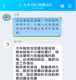 习近平总书记寄语新时代青年“强调当代青年,要继承和发扬五四精神,坚定理想信念,站稳人民立场,练就过硬本领,投身强国伟业。”新时代青年是国家的中坚力量,要接好中华民族伟大复兴的接力棒。为此,马克思主义学院特别将思政课堂延伸到学生的日常生活中,指导广大青年志愿者做好自我防护的同时,鼓励学生要牢牢站稳“一个立场”,停课不停实践,深入到人民当中去。发动学生以服务社区、网络宣传、线上陪伴等多种形式参与社会志愿服务工作。同时,激励学生也要参与到脱贫攻坚工作中去,为全面建成小康社会贡献力量。很多同学纷纷以实际行动表达坚定的“人民立场”,学以致用,勤于实践。