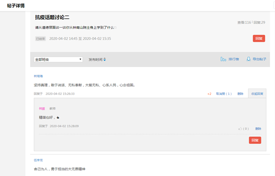这次疫情给中国人民、世界人民上了一堂生动的课。马克思主义学院要求本学期所有上课班级,以小组为单位至少开展一次网上讨论,主要围绕“抗击新型冠状病毒疫情看中国共产党员的使命担当、从抗击新型冠状病毒看我国集中力量办大事制度优势、抗击疫情与大学生成长成才、作为新时代青年大学生我们要向钟南山院士学习什么?”等议题展开。同学们通过中外对比,深刻认识到中国特色社会主义的制度优势,全国人民在党的坚强领导下攻坚克难,取得了抗击疫情的阶段性重大胜利;也认识到了当代大学生在疫情防控中要有所作为,学习钟南山院士、张定宇医生等英雄人物勇于担当、精益求精、无私奉献的精神。