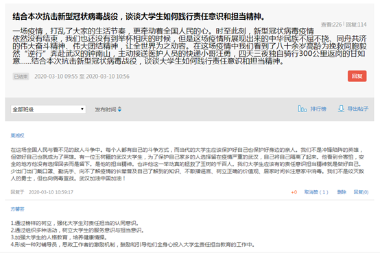 3月9日,教育部社会科学司和人民网共同推出了“全国大学生同上一堂疫情防控思政大课”活动。马克思主义学院与学校相关部门配合,统一组织全校学生对本次课进行观看和讨论。直播课程结束后, “纲要”、“原理”、“基础”三门课程的任课教师立即在班级中开展线上大讨论,引导学生厚植爱国情怀、践行责任担当、敬畏自然生命、主动担当作为。师生纷纷表示,疫情防控就是一堂生动的思政课,充分认识到了我国制度的优越性,共产党始终代表最广大人民群众根本利益的本色,坚定了打赢这场疫情防控战的信心和决心。与此同时,很多同学立下“抗疫宣言”:磨难压不垮,奋起正当时,要做好抗击疫情的“守护者”“修行者”和“识途者”。