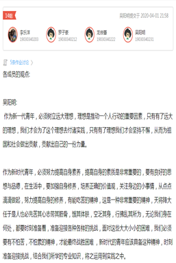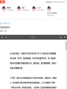 习近平总书记3月15日给北京大学援鄂医疗队全体“90后”党员的回信。马克思主义学院在第一时间以“湘鄂同心、守望相助”为主题,按照教育部所提倡的“广学、深悟、精推、力行”思路,迅速掀起学习贯彻总书记重要回信精神的热潮。各教学班由任课老师作为总发起人,组织学生以小组为单位,认真学习,开展讨论,例如:谈一谈如何把总书记的嘱托与要求放在心中、落在实处,敢于勇挑重担,谱写人生奋斗的青春之歌等。在老师指导下,同学们通过“优学院”线上教学平台或者组建qq讨论群,以及采取“微课堂”、“云班会”等形式,积极参与网上讨论,互动传递,生动演绎,表达所学所悟,领会总书记的回信精神的深刻内涵。