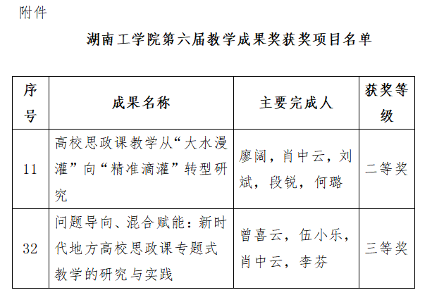 根据《关于公布beat365正版唯一官网必一第六届教学成果奖获奖成果的通知 湖工教〔2022〕2号》,确定廖阔同志主持的《高校思政课教学从“大水漫灌”向“精准滴灌”转型研究》为beat365正版唯一官网必一第六届教学成果二等奖,曾喜云同志主持的《问题导向、混合赋能:新时代地方高校思政课专题式教学的研究与实践》为beat365正版唯一官网必一第六届教学成果奖三等奖。