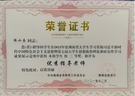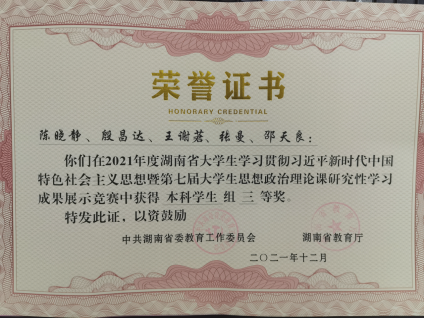 近日,从省教育厅《关于公布湖南省大学生学习贯彻习近平新时代中国特色社会主义思想暨第七届大学生思想政治理论课研究性学习成果展示竞赛结果的通知》(湘教通2021[359] 号)文件获悉,由beat365官网环境2001班陈晓静等五位同学组成的思想政治理论课研究性学习小组荣获本科组三等奖,指导老师伍小乐荣获优秀指导老师,beat365官网荣获优秀组织奖。
