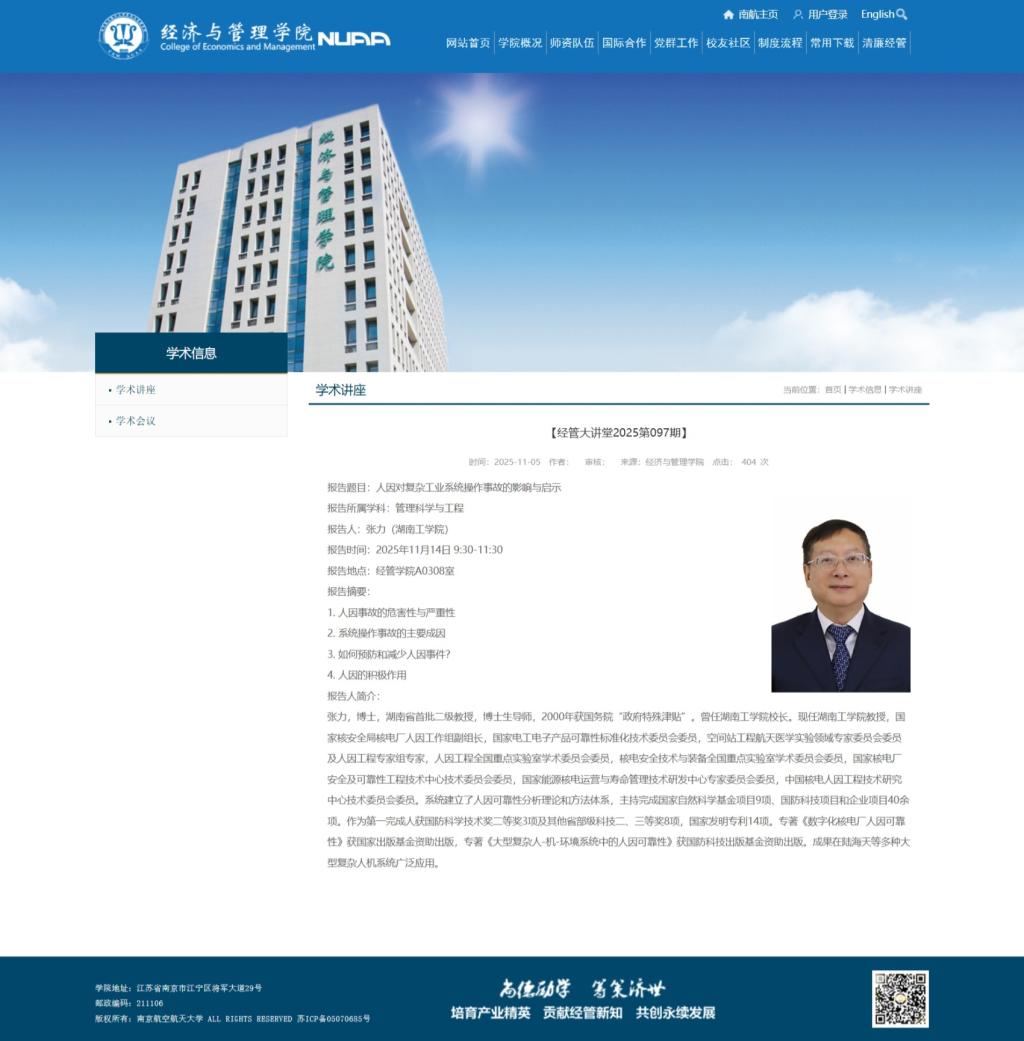 在宁期间,张力教授还受邀分别前往南京理工大学、南京航空航天大学开展学术交流,为两校师生带来两场高水准专题报告。应南京理工大学设计艺术与传媒学院邀请,张力教授作了题为《工业系统人因事故原因与防范》的学术报告;应南京航空航天大学经济管理学院邀请,作题为《人因对复杂工业系统操作事故的影响与启示》学术报告作为多项国家级科研项目的主持人,张力教授在报告中结合自身深厚的学术积淀与丰富的工程实践经验,系统阐释了复杂工业系统的人因特征及重要作用,并以不同工业领域为例,从不同角度围绕“如何发现、探究与破解复杂工业系统人因层面科学问题”展开深度分享。两场报告逻辑清晰、内容翔实,均引发参会师生的热烈研讨与积极互动。