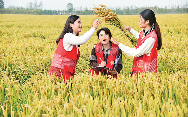 近年来,江苏省连云港市东海县审计局为确保丰收粮食储备安全,以日常检查和专项审计检查相结合,严审粮油物资储备台账、实物库存、粮食质量、档案管理等情况。图为2022年10月21日,东海县审计局粮食储备安全专项审计工作人员在高产稻麦农业产业园区检测即将丰收的水稻实产情况。中新社发 张正友/摄