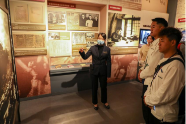 同学们认真聆听讲解员讲述抗战历史