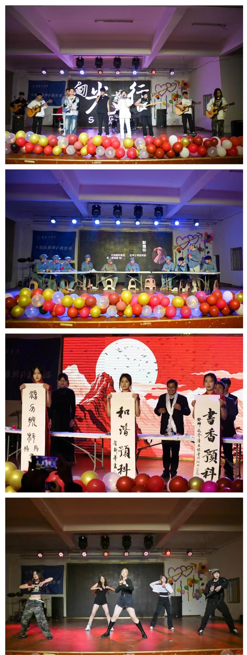 闭幕式后,热情奔放的新疆舞蹈《欢乐吧》拉开文艺汇演的序幕。文艺汇演共10个节目,涵盖说唱、舞蹈、朗诵、舞台剧、器乐合奏等多种艺术形式。藏族歌舞《幸福拉萨》、现代舞《探窗》、诗朗诵+书法《读中国》、街舞《BOOMBABYAH》展现了学生们的活力与才华;说唱歌曲《我的祖国》,讲述了抗美援朝的故事,唱响了70年前197653位中华儿女为国出征、为国捐躯的英雄赞歌,激发了现场观众的爱国热情;为纪念毛泽东主席诞辰130周年而演出的情景剧《遵义会议》,再现了我党在生死关头确立毛泽东为党的领导核心的历史场景,让大家再一次受到深刻的党史教育;歌曲《相亲相爱》,唱出了各民族手拉手、心连心,守望相助、相亲相爱的动人情感。SL(石榴)乐队带来的《茶底世界》+《平凡之路》+《祖国》等歌曲串烧,更是将晚会气氛推向高潮。晚会最后在教师代表刘蕾老师独唱的《美丽中国》和其他老师合唱的《大中国》圆满落幕。师生们精心打造、动情演绎的节目或热情律动,或低吟沉思,让现场观众既享受到艺术的盛宴,更得到爱国主义的教育熏陶,台上台下师生齐心合唱,祝福伟大祖国的场景令人动容,博得大家的阵阵掌声。