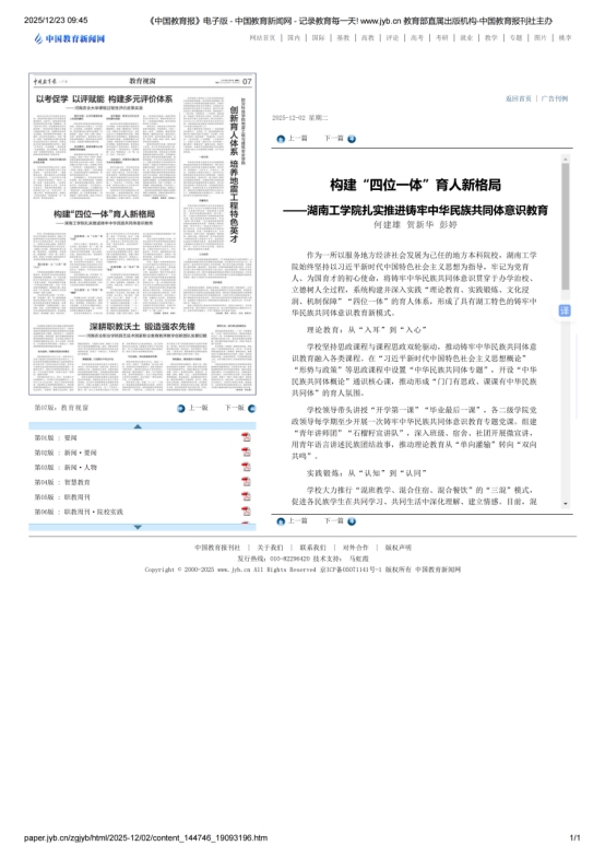 近日,《中国教育报》(2025年12月2日第07版)刊发由beat365官网何建雄、贺新华、彭婷共同撰写的专题文章《构建“四位一体”育人新格局——beat365正版唯一官网必一扎实推进铸牢中华民族共同体意识教育》,深入推介了beat365正版唯一官网必一少数民族预科教育部的育人经验及育人成效,系统阐述了beat365官网以习近平新时代中国特色社会主义思想为指导,将铸牢中华民族共同体意识融入办学治校与立德树人全过程,创新构建“理论教育、实践锻炼、文化浸润、机制保障”四位一体育人体系的探索与实践。文章从“理论教育:从‘入耳’到‘入心’”、“实践锻炼:从‘认知’到‘认同’”、“文化沁润:从‘符号’到‘情感’”、“机制保障:从‘试点’到‘体系’”等方面,详细介绍了学校通过课程融入、领导讲授、组建宣讲队、推行“三混”模式等一系列扎实举措,形成了具有本校特色的民族团结进步教育新模式。