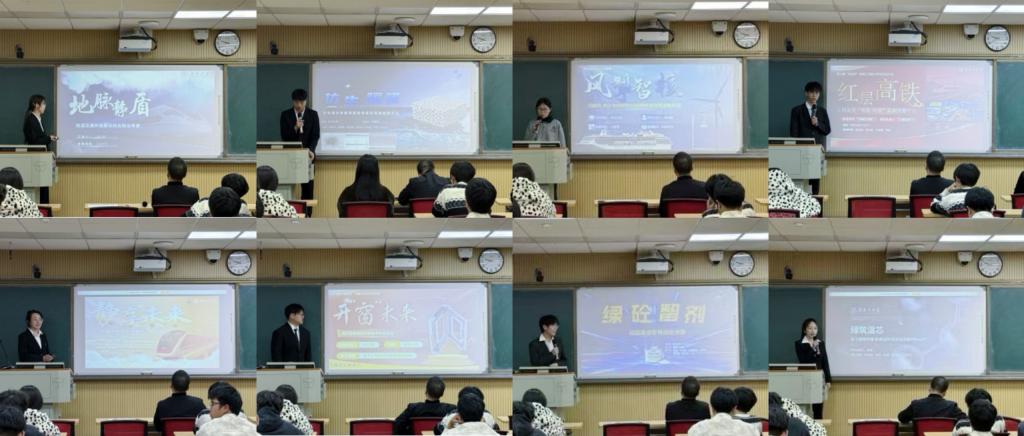 各参赛团队依次登台,从项目背景、核心技术、市场分析、商业模式及社会价值等方面对作品进行了全方位展示。参赛作品紧扣土木工程学科专业特点,既有基于新型建筑材料的研发与应用,也有聚焦智慧城市建设的智能化技术革新,还有关注绿色低碳发展与生态环保的创新方案。