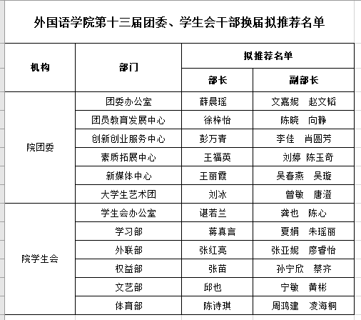 根据我院实际情况,本着“民主、公平、竞争、择优”的原则,经过公平竞争、民主表决,现将我院第十三届团委、学生会干部名单拟定结果公示如下: