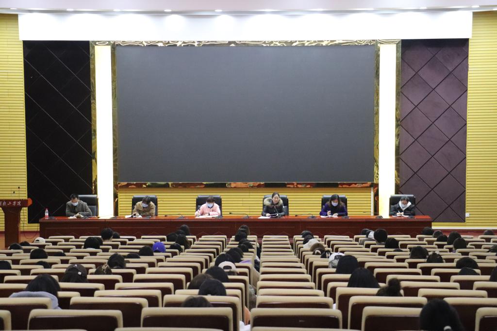 为进一步贯彻落实上级有关疫情防控工作部署,抓紧抓实抓细疫情防控工作,2022年3月21日晚,外国语学院在500人报告厅分年级、分批次地进行了3场疫情防控特护期工作推进会,外国语学院党委书记张平、党委副书记周艳红出席会议,全体辅导员、全体学生参加了大会。会议由学工办主任张伟平主持。