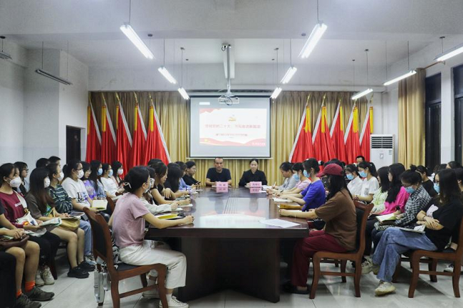 为积极引导学生党员深入学习贯彻党的二十大精神,外国语学院于11月11日晚7点在外语楼103开展“学习二十大精神”专题党课。外国语学院党委书记刘斌、各学生党支部书记、全体学生党员和2022年发展对象参加了党课学习。党课由外国语学院党委副书记周艳红主讲。