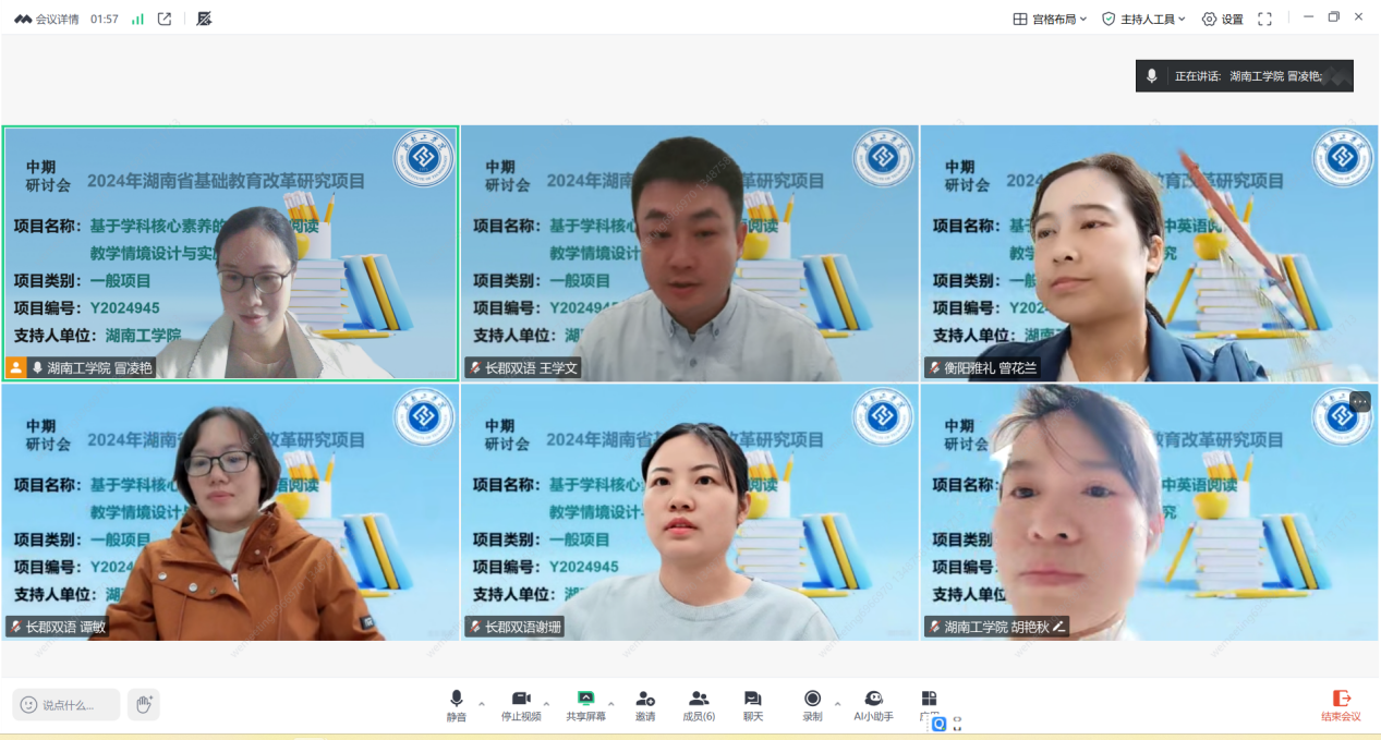 20251025日上午,第二届湖南省基础教育教学改革一般项目《基于学科核心素养的初中英语阅读教学情境设计与实施研究》(项目编号:Y2024945)中期研讨会在线上顺利召开。会议由项目主持人、语言与文化学院教师冒凌艳主持,5名项目组成员齐聚云端,共同复盘项目进展,聚焦第二轮教学实践的优化与推进。