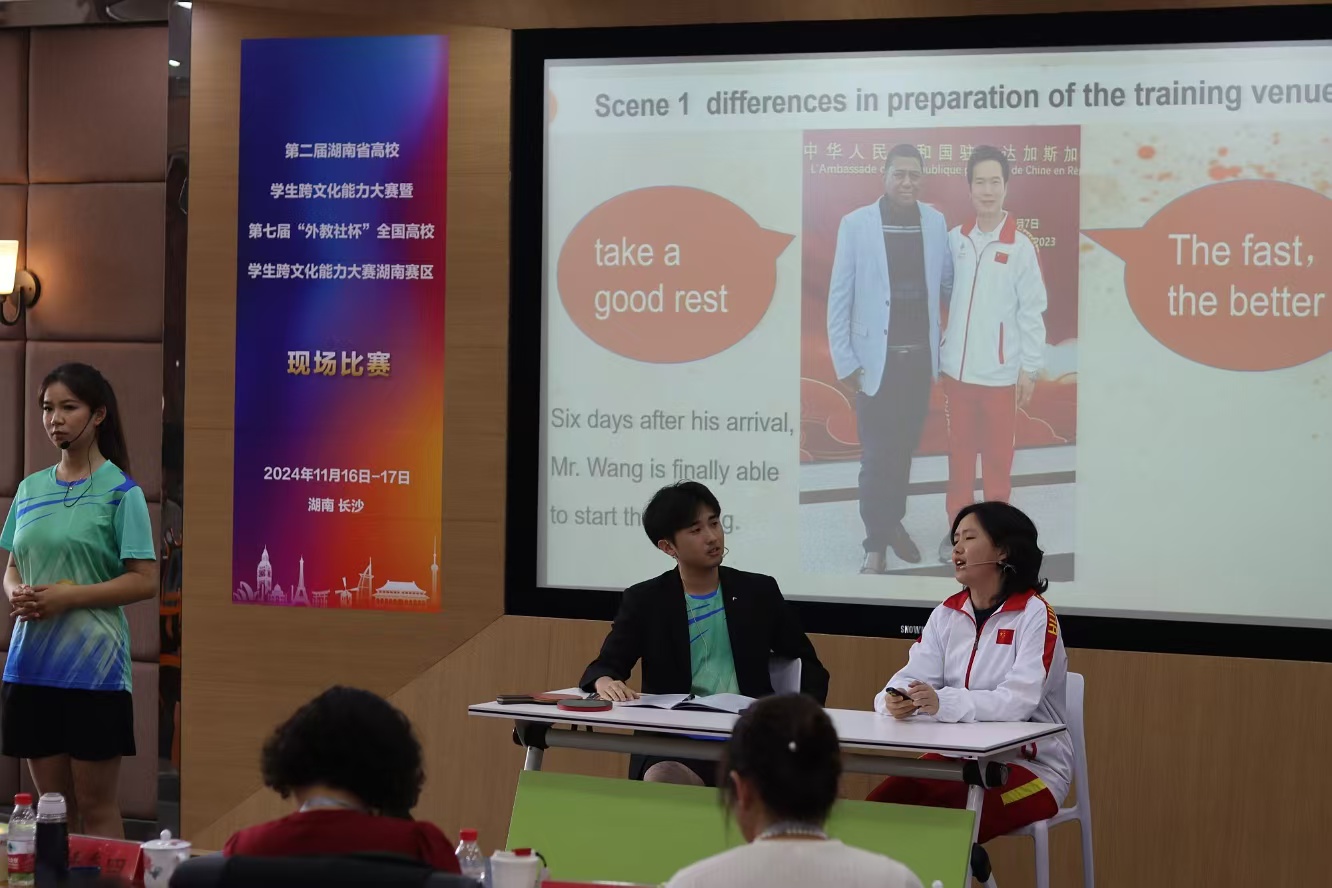 比赛中,在跨文化交际案例展析环节,选手以beat365官网体育教学部王海洋教练选派到马达加斯加共和国进行技术援助为案例背景,为体育跨文化教学、中国乒乓球精神及体育精神的交流互鉴提供成功经验,呈现了真实新颖生动的跨文化作品,展现了优秀的跨文化意识和从事跨文化交际的潜力。在关于“文化多样性”的名言名句解析环节,选手从中国多民族多文化的国情出发,结合自身与beat365官网留学生跨文化交流经历进行解析,并引用 “各美其美,美人之美,美美与共,天下大同”的中国理念,传达了开放包容的湖南态度,也展现了新时代湖湘青年的文化自信。
