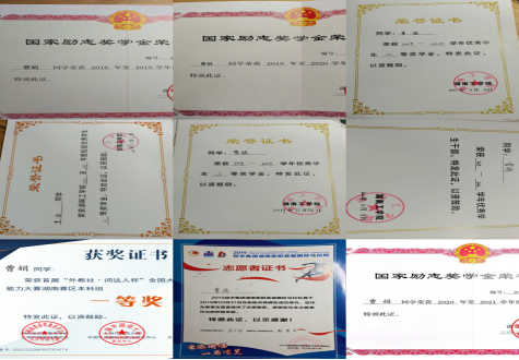 在校期间连续三年学习成绩和综测均名列前茅,荣获国家励志奖学金3次、校级二等奖学金3次、校优秀干部1次、院级优秀团员1次、湖南省首届“外教社·词达人杯”全国大学生词汇能力大赛湖南赛区本科组一等奖1次、校级协会优秀工作者2次、衡阳首届马拉松志愿者证书1次。