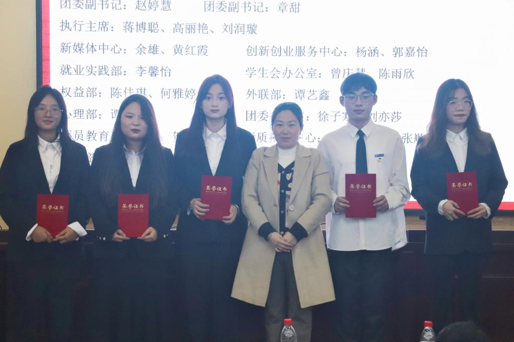 周艳红宣读了第十五届团委学生会优秀干部和优秀部门并为获奖个人和部门颁发荣誉证书。张伟平宣读了第十六届团委学生会干部名单并为部门负责人颁发聘书。