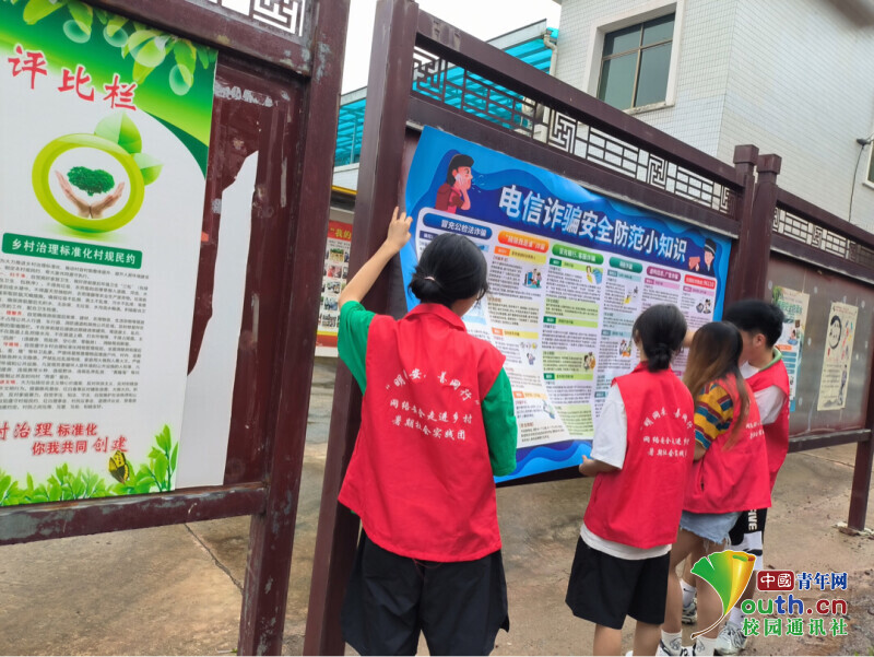 图为实践队成员在杨柳村村委会张贴电信诈骗安全防范小知识展报