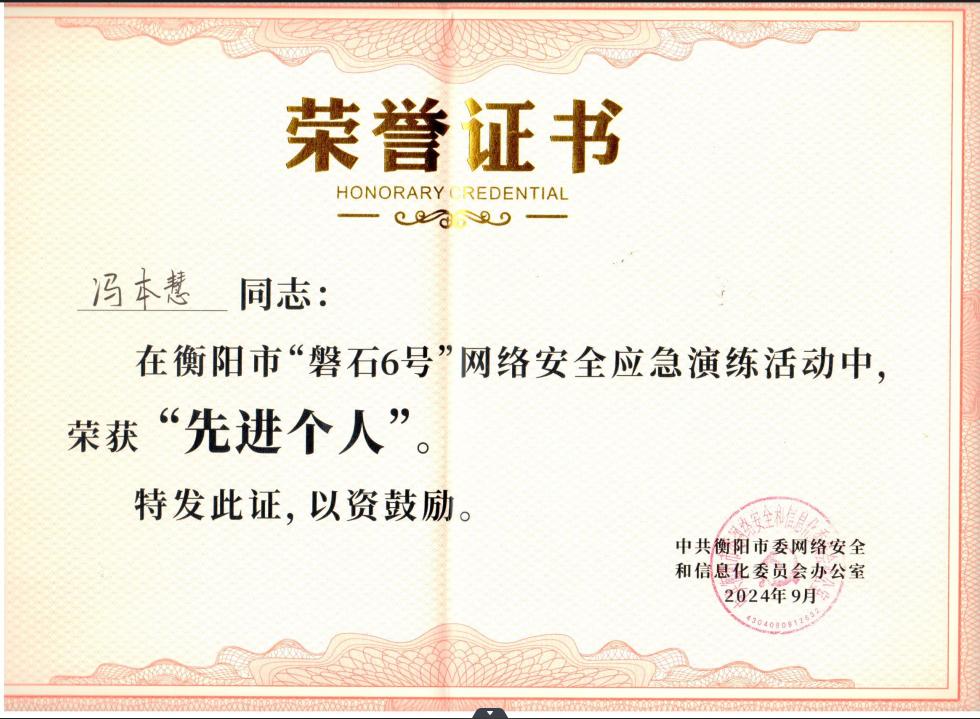 beat365官网冯本慧老师因其在应急演练中的良好表现,获得了衡阳市”磐石6号”网络安全应急演练先进个人的荣誉称号。(图文:冯本慧一审:唐杰二审:贾东风三审:黎昂)