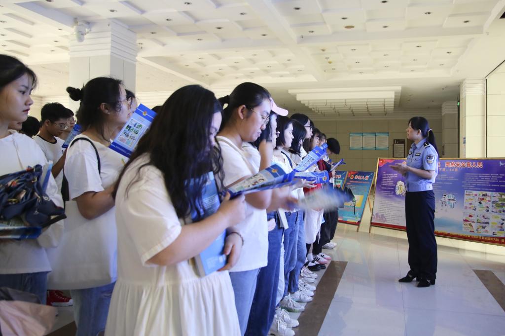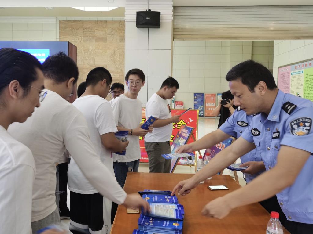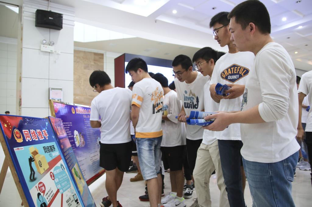 活动现场,中间巨大电子显示屏滚动播放网络安全宣传片,周边设置了宣传标语和“传谣入刑”、“网络推手”、“南岳案例”等为主题的宣传展板。工作人员向到场三百余名学生发放网络安全法、网络基本常识、网络谣言、网络诈骗等相关宣传教育资料。