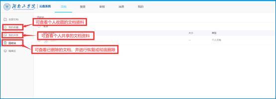 7、单击左侧的“我的收藏”可查看我收藏的文档,单击“我的共享”,可查看我共享的文档,单击“回收站”可查看我删除的文档,并进行恢复或彻底删除。