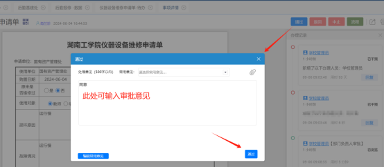 点击“处理”后,可选择直接审批通过,或填写意见后审批通过。