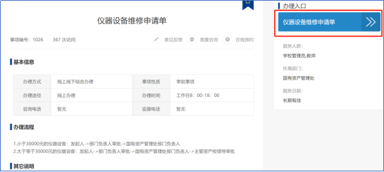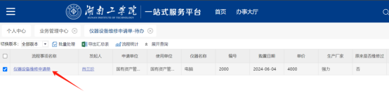 3、业务办理(申请及审批)以“仪器设备维修申请单”为例: