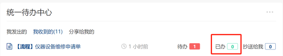 还是在“个人中心”-》“我收到的”中在“已办”中可查看本人审批过的所有申请单,点击“已办”后面的数字,可以进入已办数据列表。