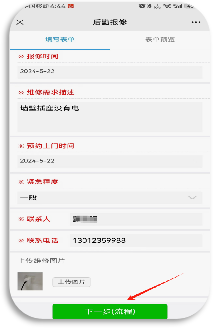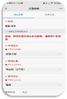 ② 点开【后勤报修】申请单,按照页面中提示填写相关信息,其中红色项目为必填项,还可以上传图片。信息填写完成后点击【下一步】,即提交成功。