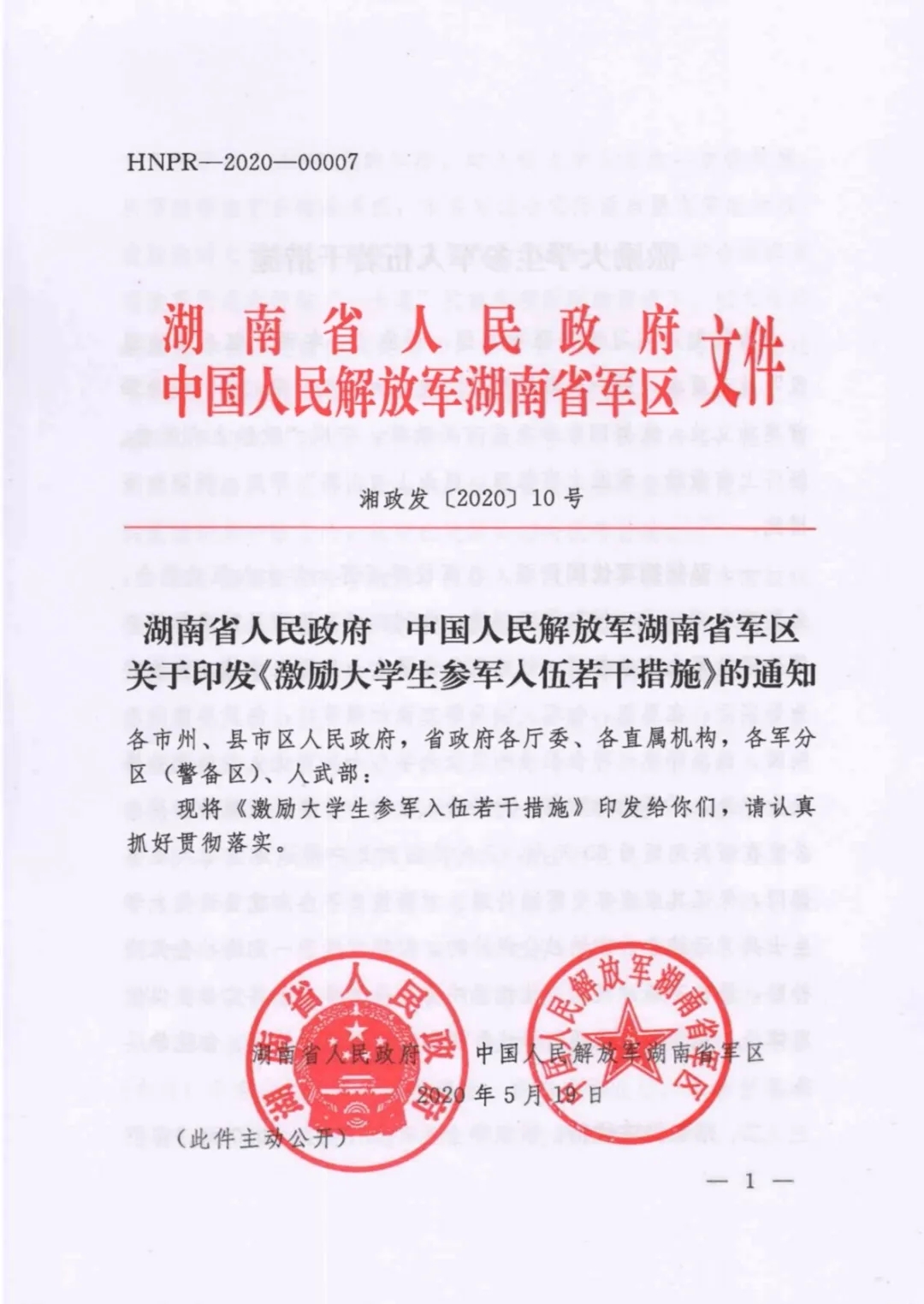 为进一步畅通大学生参军“绿色通道”,缓解大学毕业生就业压力,湖南省人民政府和省军区联合制定出台《激励大学生参军入伍若干措施》湘政发〔2020〕10号 文件从政治荣誉、复学升学、服务管理、退役安置、经济优待、就业创业等9个方面出台37条优待措施,确保大学生参军政治上有荣誉、经济上有奖励、学业上有保障、就业上有出路,激励更多优秀大学生报名应征。