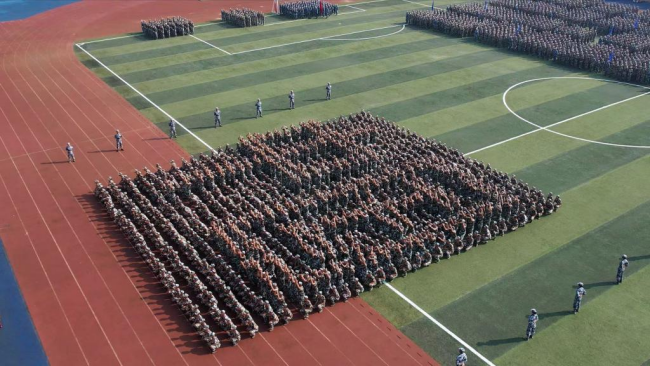 大会在雄壮的国歌声中拉开序幕,五千多名新生目光坚定,以饱满的精神面貌,整齐划一的动作展示军训会操的累累战果,嘹亮的口号声响彻整个操场。由1000名新生共同展示出的数字方阵点燃了整个现场,匕首操、枪操方阵学子们快速敏捷的动作展示出湖工学子的昂扬斗志和青春朝气。伴随着分列式进行曲,由13个学院以及学工等方阵组成的58个军训连方阵队昂首阔步,依次通过主席台,接受校领导检阅,同学们摆臂抬腿的每一个动作,勇往直前的每一个步伐,都是对青春和理想最有力的宣告。由教官们带来的摔擒表演再次将气氛推向高潮,引来阵阵喝彩。