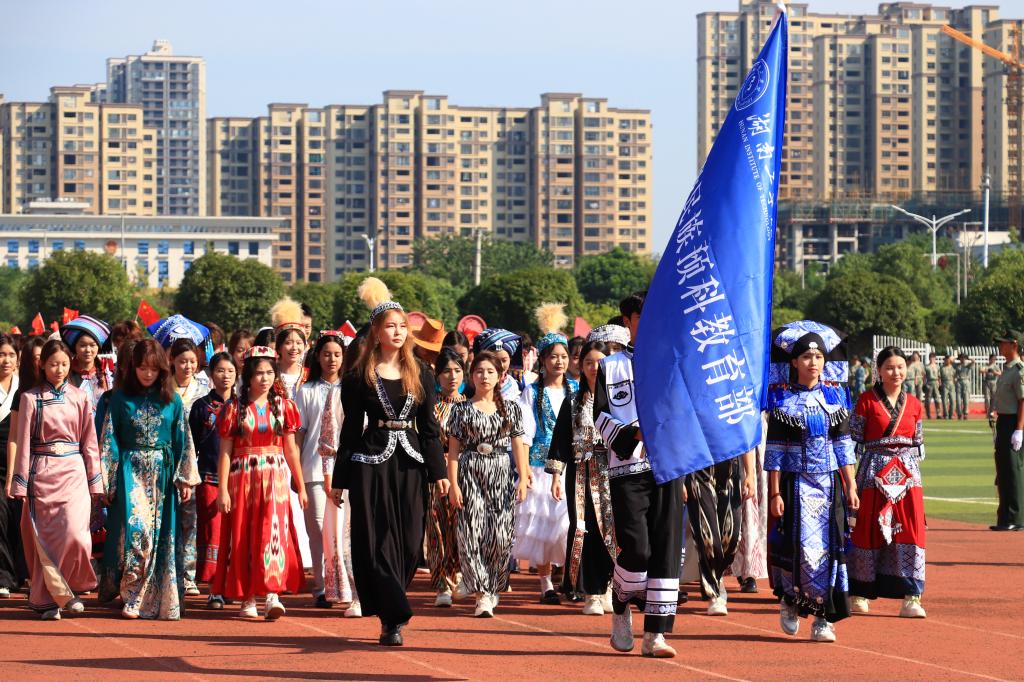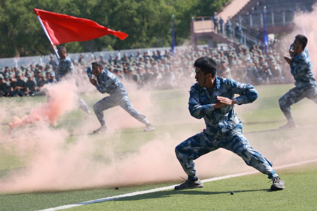 大会在庄严的国歌声中拉开帷幕。升国旗仪式后,随着校党委书记曹执令一声令下,经过为期21天的军训历练,来自全国31个省市区、涵盖30个民族的4788名新生精神抖擞,展示军训成果,彰显出青春的蓬勃力量。