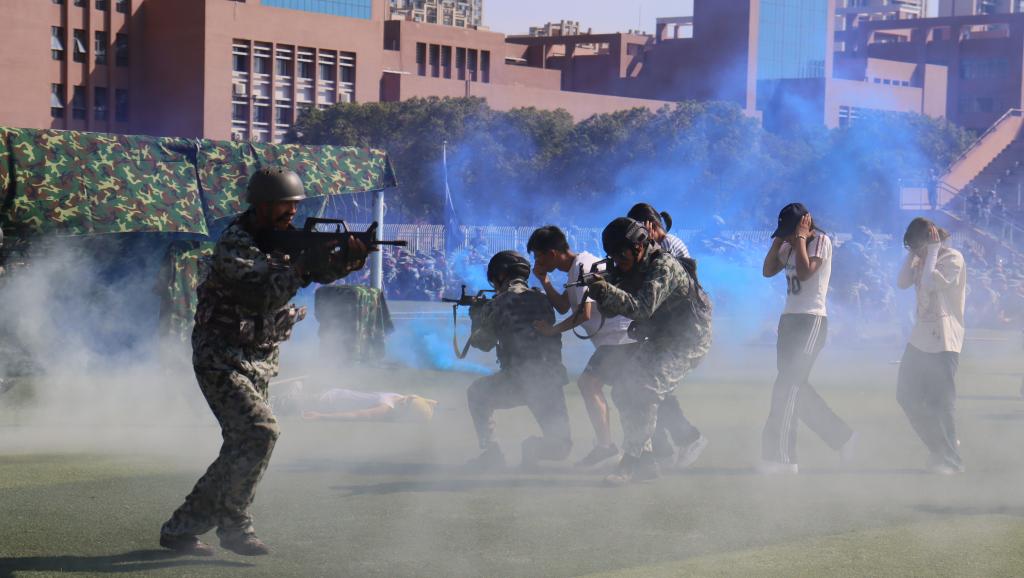 课目表演环节精彩纷呈。擒敌拳方阵以矫健的动作登场,拳风劲烈、气势如虹,每一招一式都透露着坚定的力量与过硬的技能;枪操表演队列整齐、动作精准,展示了完美的团队配合与作战智慧;匕首操方阵则以凌厉的动作诠释了刚强与不屈,充分展现了军训带来的意志力和纪律性。模拟战场上,战术方阵的学员们迅猛出击,精准执行任务,展示出卓越的军事技能与团队协作能力。战场救护环节中,学员们迅速而有序地进行伤员救护操作,充分体现了对生命的尊重与保护。