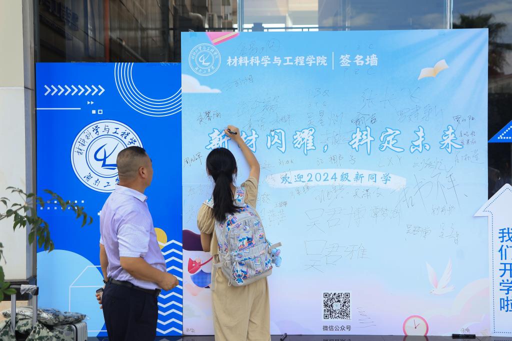 为迎接新生,各学院纷纷推出了别具匠心的迎新活动。安全与管理工程学院为新生精心准备了安“新”刮刮乐和校徽等小礼物,并设立了贴满新生寄语的祝福墙,吸引了新生和家长们合影留念,记录下温馨时刻。电气与信息工程学院与材料科学与工程学院分别设立了新生签名墙,大家在签名墙前留下了大学生活的第一份记忆。化学与环境工程学院则准备了清凉的小雪糕和酸梅汤,为在炎热天气中的新生和家长送去一丝凉意。外国语学院大厅内,中文、英语、日语精心设计的专业指示牌充满学院特色,体现了浓厚的文化氛围。计算机科学与工程学院为新生定制了印有院徽的马克杯,并邀请新生写下对四年后自己的一封信,激励他们坚守初心,勇敢追梦。设计与艺术学院则利用学生作品布置了独具创意的打卡点,引导新生勇于创新、实践。