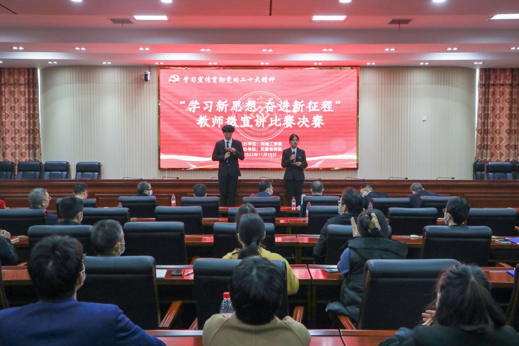 经各二级党委(党总支)初赛、党委宣传部复赛,共评选出了10名教师参加决赛。比赛现场,选手们依次围绕“学习新思想 奋进新征程”主题,运用生动故事、翔实数据,创新方式方法宣传党的二十大精神。