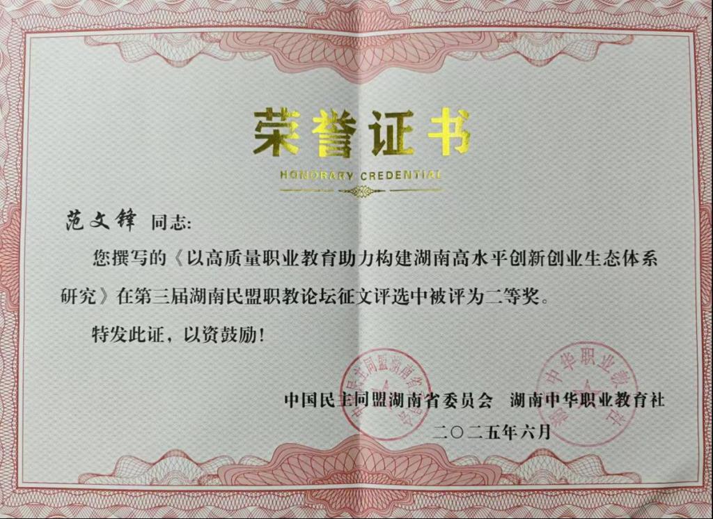 6月19-20日,第三届湖南民盟职教论坛在衡阳召开。beat365官网盟员范文锋撰写的《以高质量职业教育助力构建湖南高水平创新创业生态体系研究》在第三届湖南民盟职教论坛征文评选中被评为二等奖,受到民盟湖南省委、湖南中华职业教育社的表彰。