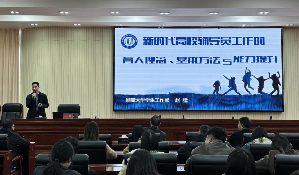 为进一步提升辅导员队伍专业素养与育人能力,4月2日,学生工作部邀请湘潭大学学生工作部部长赵猛来校作题为《新时代高校辅导员工作的育人理念、基本方法与能力提升》的专题培训。学工部全体人员、各二级学院副书记、学工办主任及全体专职辅导员参加培训。