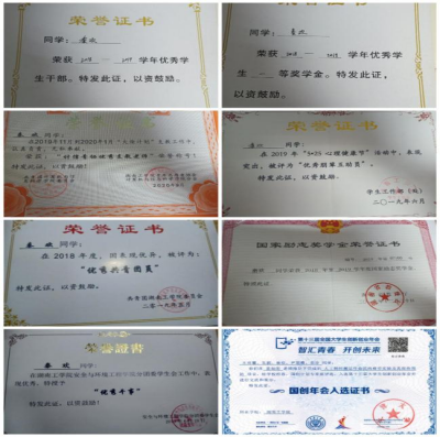 在校期间连续三年班级成绩和综测均为第一,荣获国家奖学金1次,国家励志奖学金2次,校级特等奖学金1次,校级一等奖学金2次、校三好学生2次,校优秀干部1次,校优秀团员干部1次,三下乡优秀个人1次。