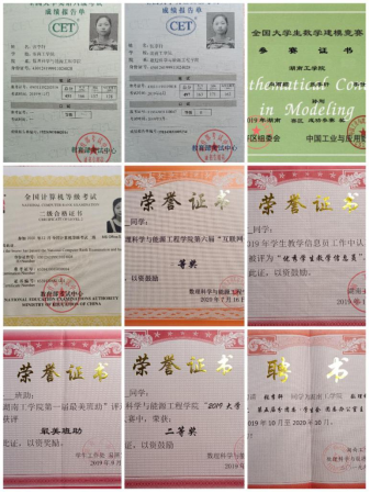 在校期间获得国家奖学金1次、国家励志奖学金2次、校优秀学生一等奖学金3次、校优秀共青团干1次、校优秀共青团员2次、优秀班干部1次。此外,荣获湖南省挑战杯竞赛三等奖、校互联网+创新创业大赛一等奖、校电子商务大赛二等奖、校圆融杯电子设计大赛二等奖、院主持人大赛一等奖、院职业生涯规划大赛一等奖、院爱国主题征文比赛一等奖等奖项。