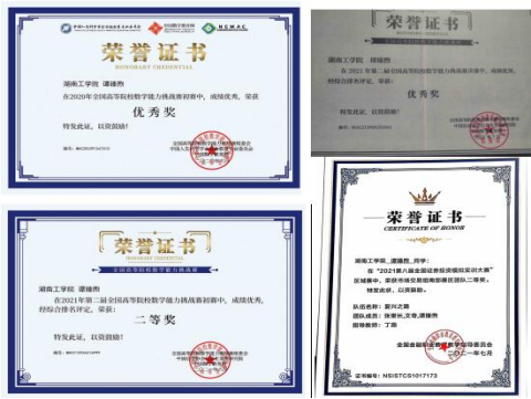 在校期间获得2021年湖南省大学生数学竞赛(非数学组)三等奖、2021年度“恒企奖教奖学助学基金”一等奖学金、2020-2021学年国家奖学金、2020-2021学年校特等奖学金、第二届全国高等院校数学能力挑战赛决赛优秀奖、第八届全国证券投资模拟大赛市场交易组南部赛区团队二等奖、第一届全国高等院校数学能力挑战赛初赛优秀奖、2019年beat365正版唯一官网必一优秀社团干部、beat365正版唯一官网必一第五届大学生思想政治理论课研究性学习成果展示竞赛特等奖、第五届湖南省“互联网+”大学生创新创业大赛校选拔赛(数能学院主赛道)三等奖。
