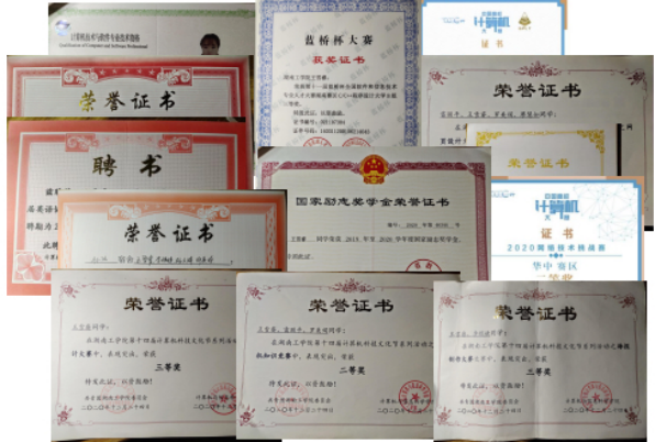 在校期间获得国家励志奖学金、优秀学生一等奖学金、校级三好学生、校级优秀学生干部、2020团体程序设计天梯赛全国总决赛参与奖、2020 中国高校计算机网络挑战赛华中赛区二等奖、第十一届蓝桥杯湖南赛区三等奖、互联网+校级三等奖、网页设计大赛一等奖、PS设计大赛一等奖、微生活微电影大赛二等奖等荣誉。