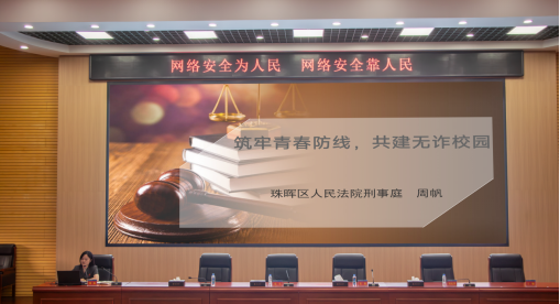 袁勤在致辞中对珠晖区政法系统组织的校园反电诈宣讲活动表示感谢,阐述了织密校园反诈防护网的重要性,并对后续宣传教育防范工作提出明确要求。邓雪从平安建设角度作动员讲话,为校地协同反诈工作提供指导。珠晖区人民法院刑事审判庭副庭长周帆做主题宣讲,她结合审判实务,深入剖析了当前电诈形势、常见手法及防范措施,通过真实案例增强师生辨别和应对诈骗的能力。
