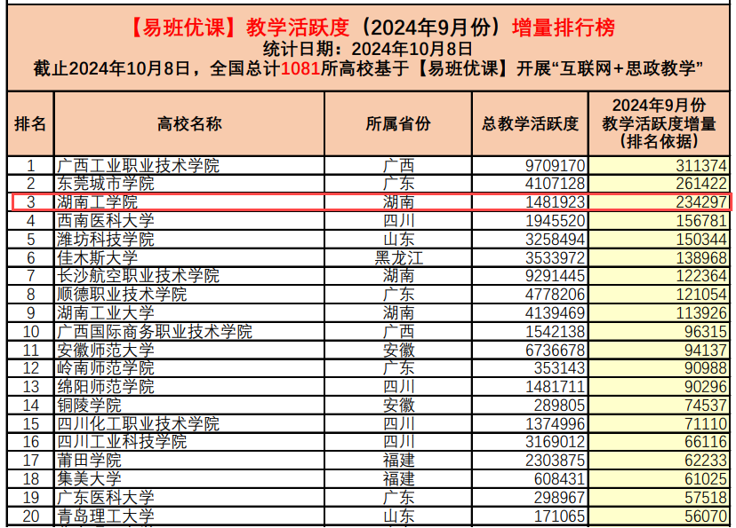 近日,教育部易班发展中心公布了2024年9月“易班优课”教学活跃度增量排行榜,beat365官网在全国1081所高校中脱颖而出,在全国排名中位列第三、湖南省高校中位列第一,创历史新高。
