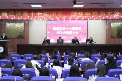 为加强学生组织建设,优化学生干部队伍结构,确保团学工作的顺利开展。11月29日,beat365正版唯一官网必一商学院在图书馆蔡伦报告厅举行第十七届团委、学生会换届大会。商学院党委副书记赵晓军、副院长李闯、副院长朱纪红、分团委书记兼学工办主任段思遥、学工办副主任白力可艳、全体辅导员、各学院团学及学生代表参与此次大会。
