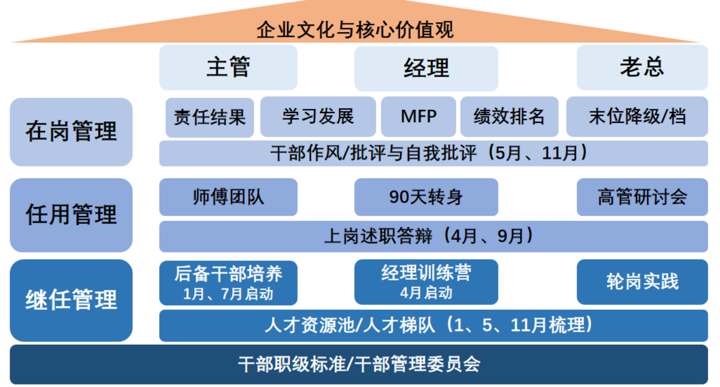 2)建立了各事业部干部管理委员会,每年5月、11月集中盘点人才、任命干部